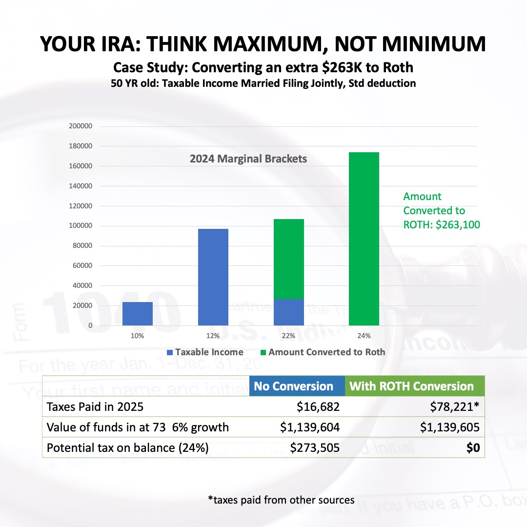 By converting to ROTH strategically and maximize your tax brackets, you lock in lower tax rates, reduce or eliminate RMDs, and secure tax-free growth.